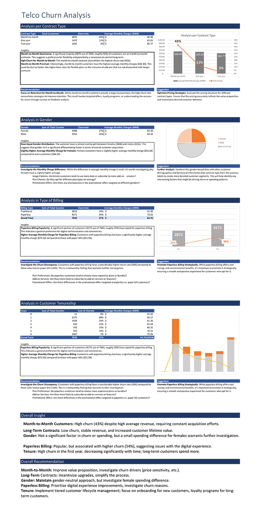 The Telco Churn Analysis identifies key drivers of customer churn and provides recommendations for improvement. The most critical finding is the high churn rate (43%) among month-to-month customers, despite their substantial revenue contribution. This necessitates ongoing customer acquisition efforts. Conversely, long-term contracts (one and two years) demonstrate significantly lower churn and higher customer lifetime value. While gender doesn’t significantly impact churn, a small spending difference between genders warrants further investigation. Surprisingly, paperless billing, while popular, is associated with a higher churn rate (34%), suggesting potential issues with the digital experience. Finally, customer tenure is inversely related to churn; the longer a customer stays, the less likely they are to leave. Based on these insights, the report recommends improving the value proposition for month-to-month customers, streamlining the upgrade process for long-term contracts, investigating the reasons behind paperless billing churn, and implementing a tiered customer lifecycle management approach focusing on onboarding for new customers and loyalty programs for long-term customers.