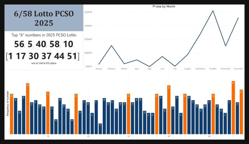 The bar chart highlights the frequency of each number drawn, while the line graph represents the prize amounts won each month, with notable peaks in October and December. Although high-frequency numbers may suggest patterns, it is important to remember that lotto draws remain entirely random.